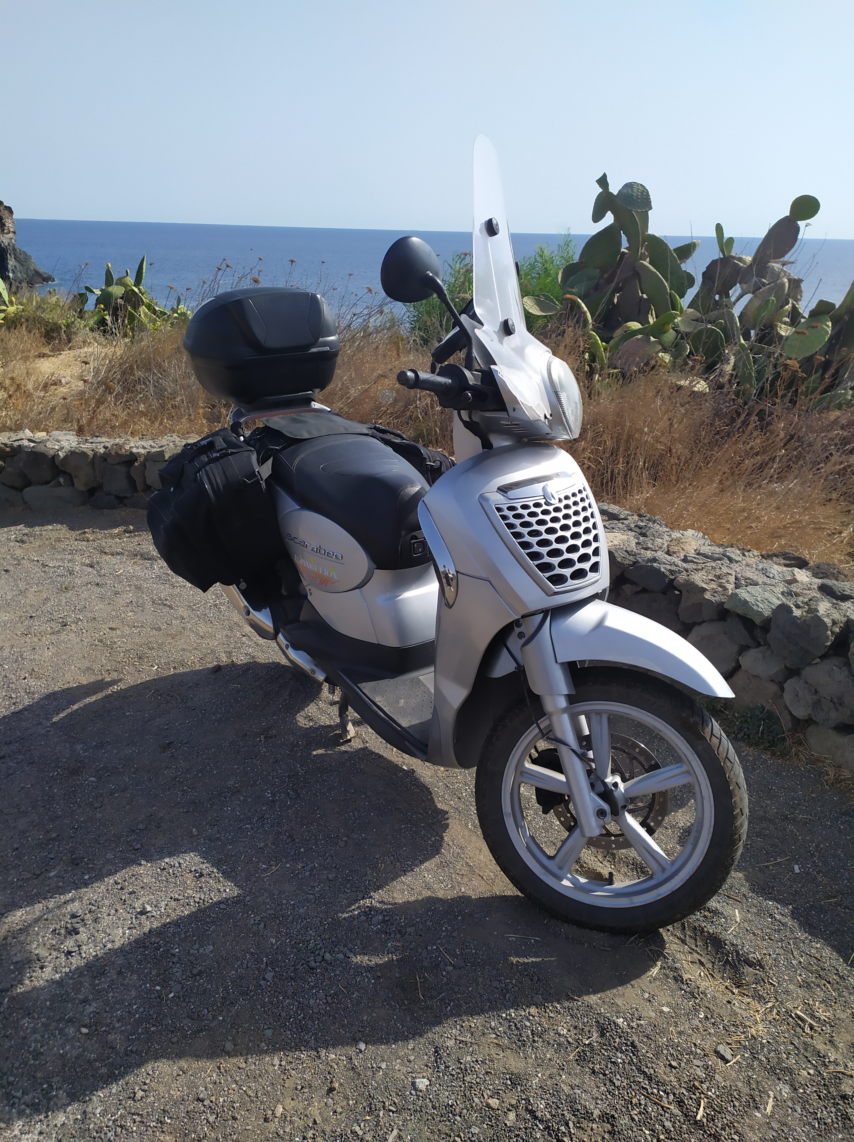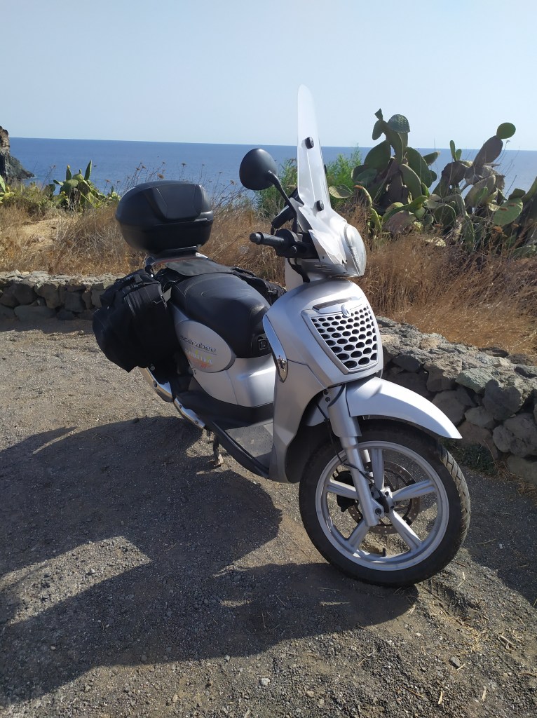 Circa due anni fa, grazie al mio amico Anto, che mi ha incoraggiato ad uscire dai “confini cittadini”, ho scoperto il piacere di fare delle gite in scooter, dandomi la possibilità di realizzare ciò che avevo sempre sognato di fare, ma che per paura o mancanza di iniziativa non avevo mai fatto. Prima di allora per mia concezione, lo scooter era soltanto un mezzo di “trasporto urbano” oppure finalizzato allo svolgimento della mia precedente attività lavorativa, mai avrei immaginato che potesse regalarmi delle bellissime emozioni, facendomi ammirare paesaggi, sia dove sono solito passare, che nuovi, da una prospettiva completamente diversa da quella a cui ero abituato a vedere viaggiando sulle quattro ruote. Nonostante la cilindrata modesta del mio Scarabeo 200IE sono riuscito a raggiungere località che si trovano ben oltre i confini della mia provincia di appartenenza. L’estate appena trascorsa sono partito per Pantelleria, e la cosa che più mi ha sorpreso del mio scooter è che se saputo ben organizzare, ci si può ricavare tantissimo spazio sia dal vano sotto sella sia dal bauletto posteriore, inoltre aggiungendo delle borse laterali si riesce benissimo a far entrare tutto il necessario ed oltre per un soggiorno di 3-4 o anche di più, e procedendo ad un’andatura di circa 70/80 Km/h su strade statali o provinciali e facendo le dovute soste, è possibile raggiungere mete a medio e lungo raggio senza mettere sotto sforzo il motore. Ovviamente per intraprendere queste “avventure” è sempre buona cosa mantenerne alta l’efficienza, oltre ad altissimo grado di prudenza. Infatti non basta fare il solito tagliando con cambio di olio, filtri e liquidi vari, ma è importante che freni, sospensioni e gomme siano sempre al top senza dimenticare di indossare anche un buon casco protettivo. Con questo articolo ci tenevo a spezzare un tabù ovvero che scooter a ruota alta di media cilindrata possono essere usati benissimo per fare delle piacevoli gite non solamente per girare in città, e a tal proposito mi piacerebbe invitare quante più persone al gruppo Open Bikers, un gruppo di aggregazione, libero e indipendente senza costi e vincoli di affiliazione, nato per passare dei piacevoli momenti in sella ai nostri “pony”. Chi volesse può contattarmi tramite l’apposito form che si trova nella pagina dei contatti. Ovvio che non ho scoperto l’acqua calda, però purtroppo ho notato che dalle mie parti molte persone non osano allontanarsi oltre un raggio di 50 km, convinte di non poter affrontare un determinato tragitto. In ultimo ci tenevo a dire che questo può essere un bellissimo hobby e nemmeno tanto costoso, mediamente con un pieno di 10€ si percorrono circa 250 km, però richiede tantissima prudenza. E’ una cosa che ci tengo a precisare e non mi stancherò mai di ribadire. Detto questo se volete potete dare uno sguardo alle foto che ho fatto durante i miei tour, cliccando sul link qui in basso.