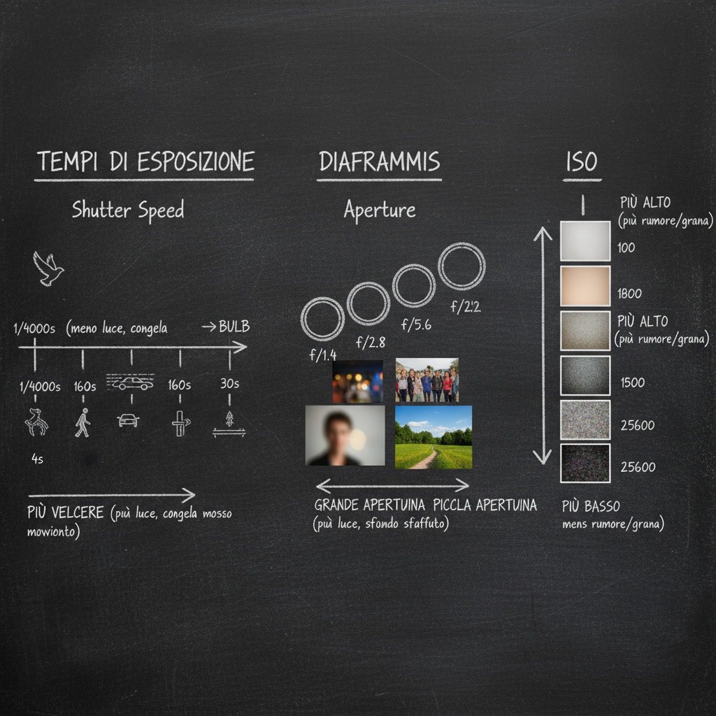 Quando scattiamo una foto, due delle impostazioni più importanti per controllare l’immagine sono la scala dei tempi e la scala dei diaframmi. I due elementi lavorano insieme per determinare quanta luce entra nella fotocamera e come questa luce influenzerà l’aspetto finale della foto. In fine un altro parametro fondamentale che influenza la qualità e l’estetica di uno scatto è l’ISO. Questi tre elementi sono interconnessi: modificare uno di essi richiede di aggiustare uno o entrambi gli altri per mantenere la stessa esposizione, trovando un equilibrio che il fotografo controlla per ottenere la corretta luminosità dell’immagine.