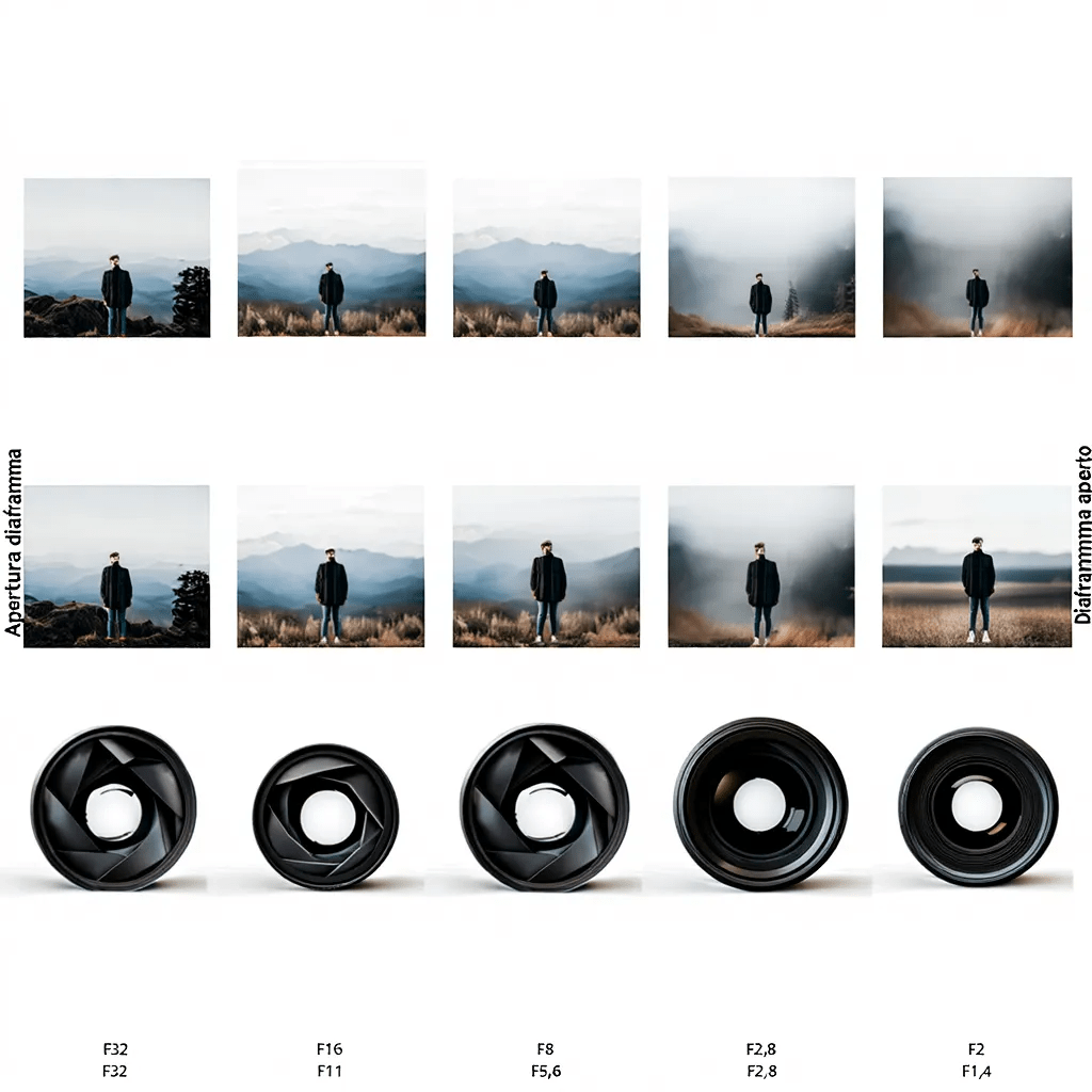 - Diaframma: È l’apertura nel obiettivo che lascia passare la luce. I valori f (f-stop) rappresentano diversi livelli di apertura, dove un valore più basso indica un’apertura più ampia e quindi più luce. Ogni incremento di uno stop sul diaframma corrisponde a dimezzare o raddoppiare la quantità di luce che passa. Per esempio, passare da f/5.6 a f/8 dimezza la luce, mentre da f/8 a f/5.6 la raddoppia.